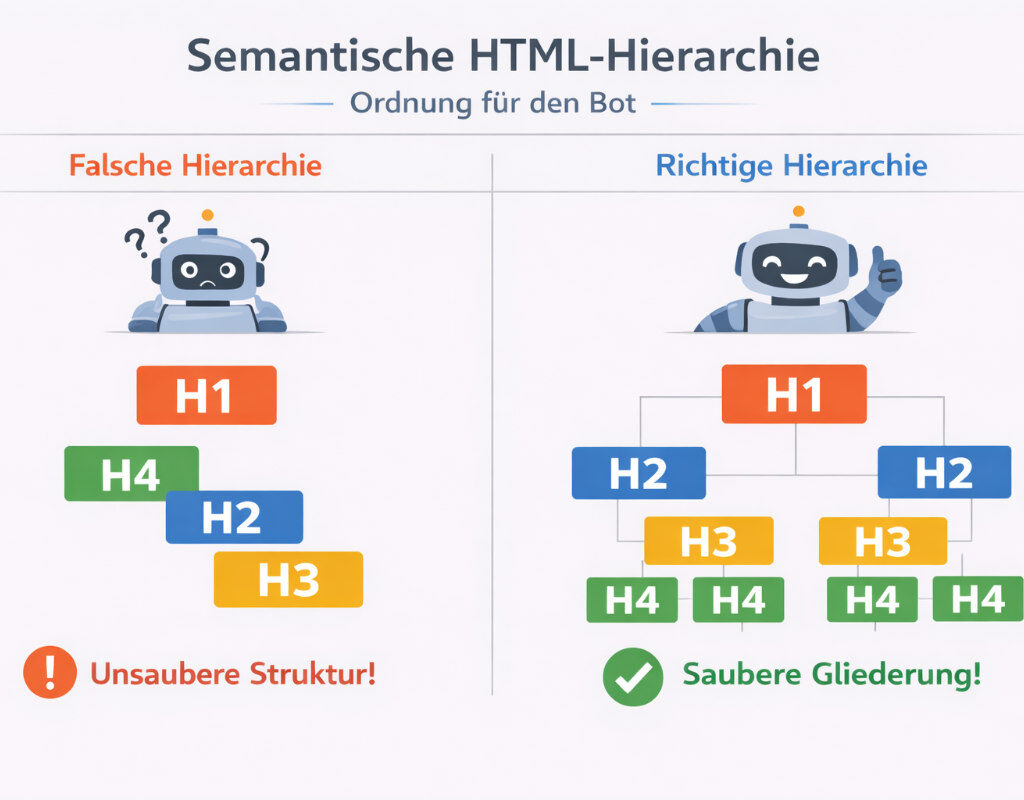 KI-Crawler (wie der GPTBot) sehen eine Website nicht visuell, sie lesen den Code. Eine unsaubere Überschriften-Struktur verwirrt das Sprachmodell. Wenn eine H4 vor einer H2 steht, nur weil es „schöner aussieht“, verliert die Seite de facto ihre logische Gliederung.